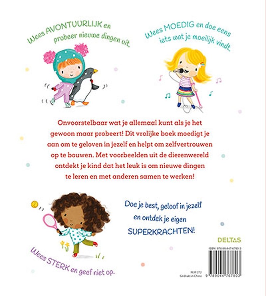 Met behulp van leuke voorbeelden uit het dierenrijk moedigt dit prentenboek jonge kinderen aan om nieuwe dingen te proberen, zelfvertrouwen op te bouwen en weerbaar te worden in het leven. Als je het gewoon probeert, zul je versteld staan van wat je allemaal kunt! Het web van een spin is supersterk, maar als het kapotgaat, maakt ze gewoon een nieuw. Bevers helpen elkaar om een dam te bouwen en eendjes vinden het spannend om voor het eerst in het water te springen, maar doen het toch. En jij? Hou jij ervan om iets nieuws uit te proberen of samen te werken? Met prachtige, kleurrijke illustraties Susie Brooks is een bekroonde auteur en schrijft al meer dan tien jaar non-fictie en prentenboeken voor kinderen. Haar inspiratie haalt ze uit haar vele wereldreizen. Cally Johnson-Isaacs is afgestudeerd in illustratie aan het Newcastle Art College. Haar eenvoudige en vrolijke illustraties zitten vol warmte en zachtheid en hebben veel fans op haar instagrampagina 'callyjanestudio'.