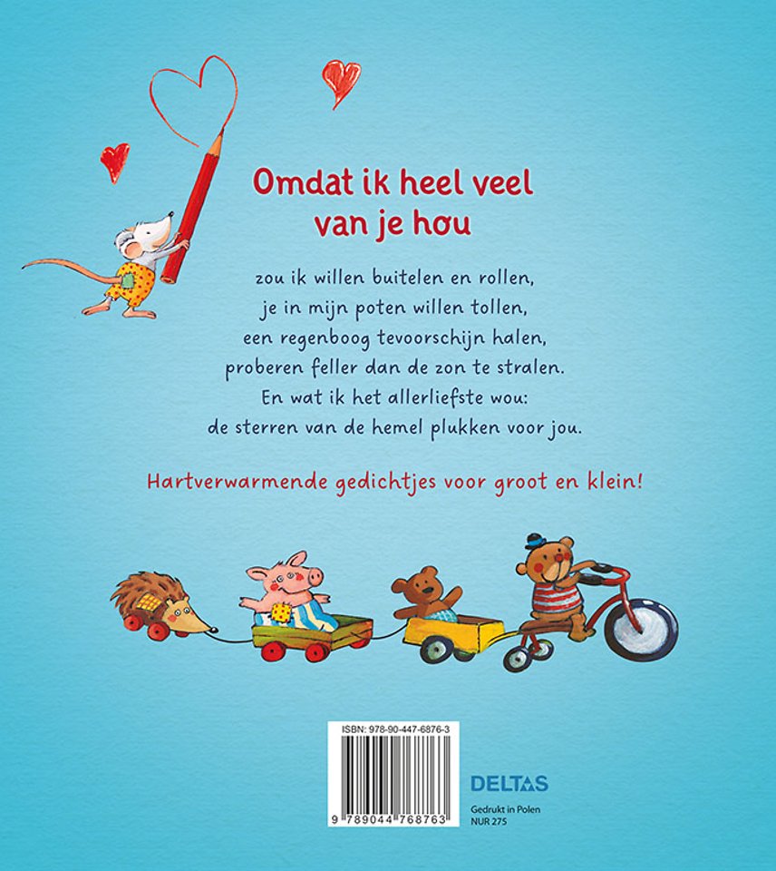 Omdat ik heel veel van je hou, zou ik willen buitelen en rollen, je in mijn pootjes willen tollen, een regenboog tevoorschijn halen, proberen feller dan de zon te stralen. En wat ik het allerliefste wou: de sterren van de hemel plukken voor jou. Hartverwarmende gedichtjes voor groot en klein!