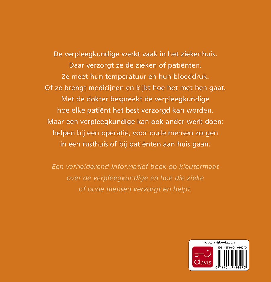 Een verhelderend informatief boek op kleutermaat over de verpleegkundige en hoe die zieke of oude mensen verzorgt en helpt.