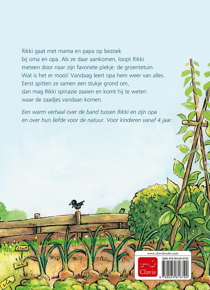 Rikki gaat met mama en papa op bezoek bij oma en opa. Als ze daar aankomen, loopt Rikki meteen door naar zijn favoriete plekje: de groentetuin. Wat is het er mooi! Vandaag leert opa hem weer van alles. Eerst spitten ze samen een stukje grond om, dan mag Rikki spinazie zaaien en komt hij te weten waar de zaadjes vandaan komen.
