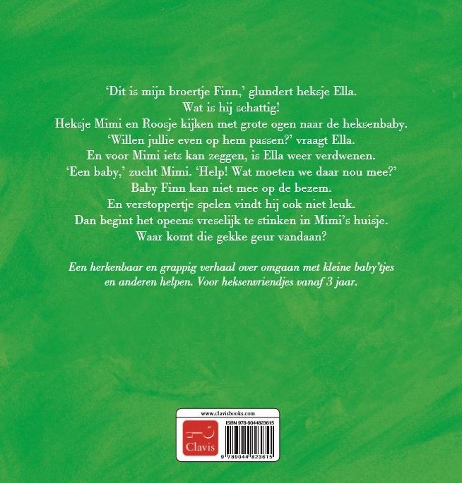 'Dit is mijn broertje Finn,' glundert heksje Ella. Wat is hij schattig! Heksje Mimi en Roosje kijken met grote ogen naar de heksenbaby. 'Willen jullie even op hem passen?' vraagt Ella. En voor Mimi iets kan zeggen, is Ella weer verdwenen. 'Een baby,' zucht Mimi. 'Help! Wat moeten we daar nou mee?' Baby Finn kan niet mee op de bezem. En verstoppertje spelen vindt hij ook niet leuk. Dan begint het opeens vreselijk te stinken in Mimi's huisje. Waar komt die gekke geur vandaan?