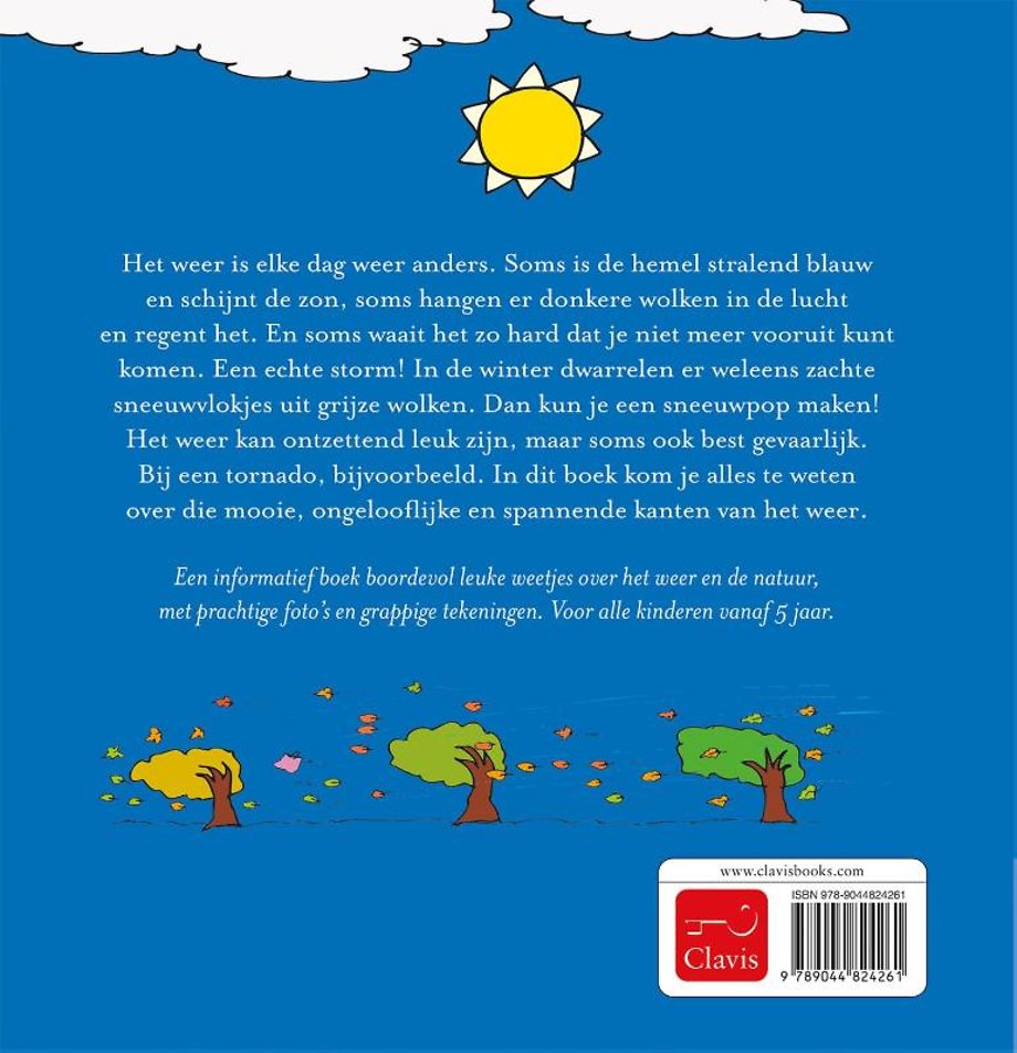 Het weer is elke dag weer anders. Soms is de hemel stralend blauw en schijnt de zon, soms hangen er donkere wolken in de lucht en regent het. En soms waait het zo hard dat je niet meer vooruit kunt komen. Een echte storm! In de winter dwarrelen er weleens zachte sneeuwvlokjes uit grijze wolken. Dan kun je een sneeuwpop maken! Het weer kan ontzettend leuk zijn, maar soms ook best gevaarlijk. Bij een tornado, bijvoorbeeld. In dit boek kom je alles te weten over die mooie, ongelooflijke en spannende kanten van het weer.