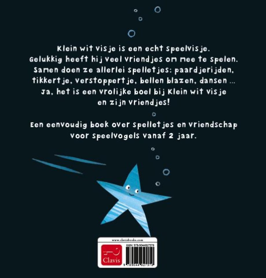 Klein wit visje is een echt speelvisje. Gelukkig heeft hij veel vriendjes om mee te spelen. Samen doen ze allerlei spelletjes: paardjerijden, tikkertje, verstoppertje, bellen blazen, dansen ... Ja, het is een vrolijke boel bij Klein wit visje en zijn vriendjes!