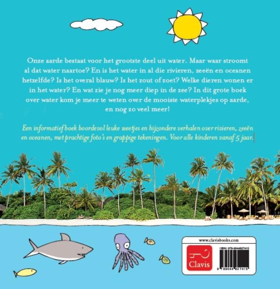 Onze aarde bestaat voor het grootste deel uit water. Maar waar stroomt al dat water naartoe? En is het water in al die rivieren, zeeën en oceanen hetzelfde? Is het overal blauw? Is het zout of zoet? Welke dieren wonen er in het water? En wat zie je nog meer diep in de zee? In dit grote boek over water kom je meer te weten over de mooiste waterplekjes op aarde, en nog zo veel meer!