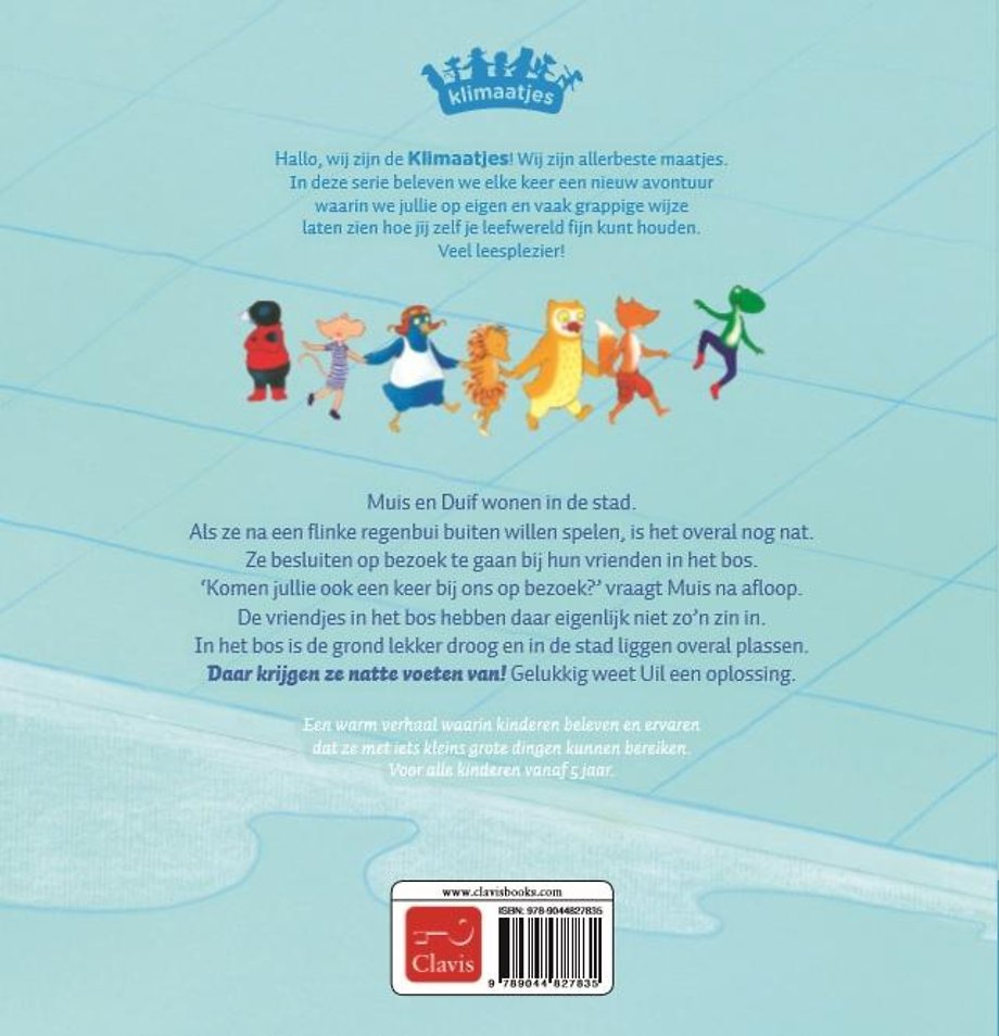 Muis en Duif wonen in de stad. Als ze na een flinke regenbui buiten willen spelen, is het overal nog nat. Ze besluiten op bezoek te gaan bij hun vrienden in het bos. 'Komen jullie ook een keer bij ons op bezoek?' vraagt Muis na afloop. De vriendjes in het bos hebben daar eigenlijk niet zo'n zin in. In het bos is de grond lekker droog en in de stad liggen overal plassen. Daar krijgen ze natte voeten van! Gelukkig weet Uil een oplossing.