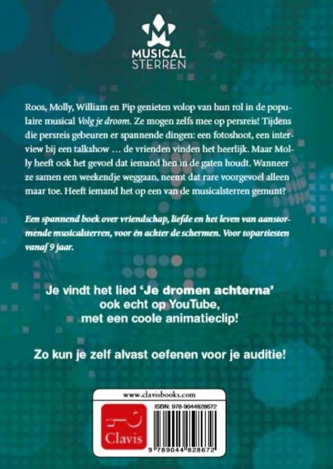 Roos, Molly, William en Pip genieten volop van hun rol in de populaire musical Volg je droom. Ze mogen zelfs mee op persreis! Tijdens die persreis gebeuren er spannende dingen: een fotoshoot, een interview bij een talkshow ... de vrienden vinden het heerlijk. Maar Molly heeft ook het gevoel dat iemand hen in de gaten houdt. Wanneer ze samen een weekendje weggaan, neemt dat rare voorgevoel alleen maar toe. Heeft iemand het op een van de musicalsterren gemunt?