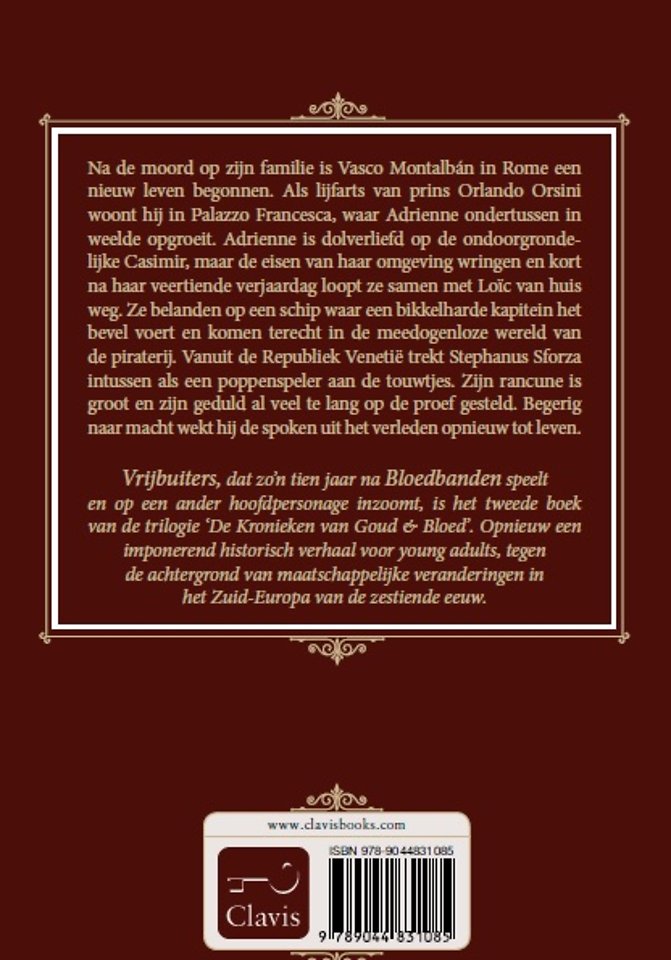 Vrijbuiters, dat zo'n tien jaar na Bloedbanden speelt en op een ander hoofdpersonage inzoomt, is het tweede boek van de trilogie 'De Kronieken van Goud & Bloed'. Opnieuw een