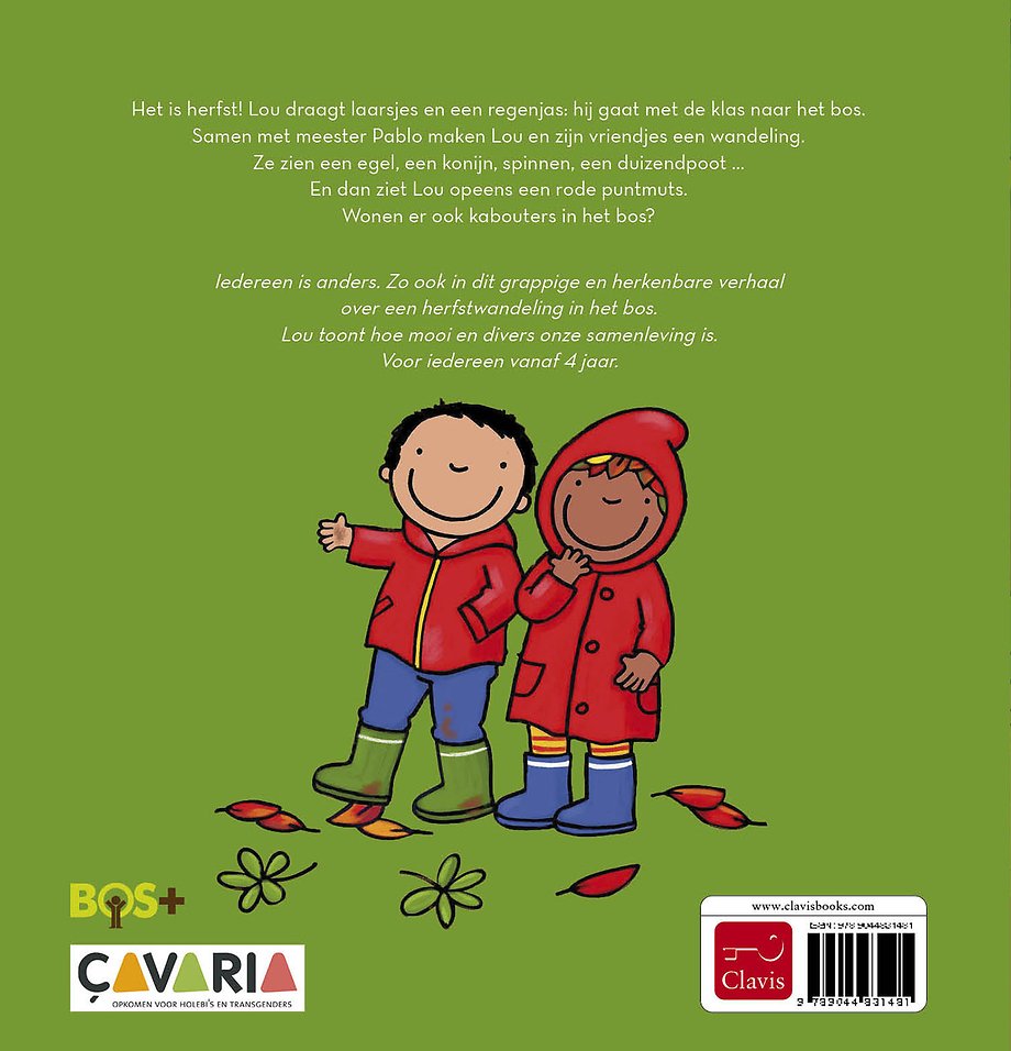 Het is herfst! Lou draagt laarsjes en een regenjas: hij gaat met de klas naar het bos. Samen met meester Pablo maken Lou en zijn vriendjes een wandeling. Ze zien een egel, een konijn, spinnen, een duizendpoot ... En dan ziet Lou opeens een rode puntmuts. Wonen er ook kabouters in het bos?