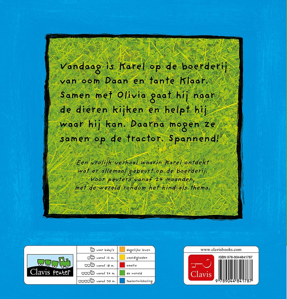 Vandaag is Karel op de boerderij van oom Daan en tante Klaar. Samen met Olivia gaat hij naar de dieren kijken en helpt hij waar hij kan. Daarna mogen ze samen op de tractor. Spannend!