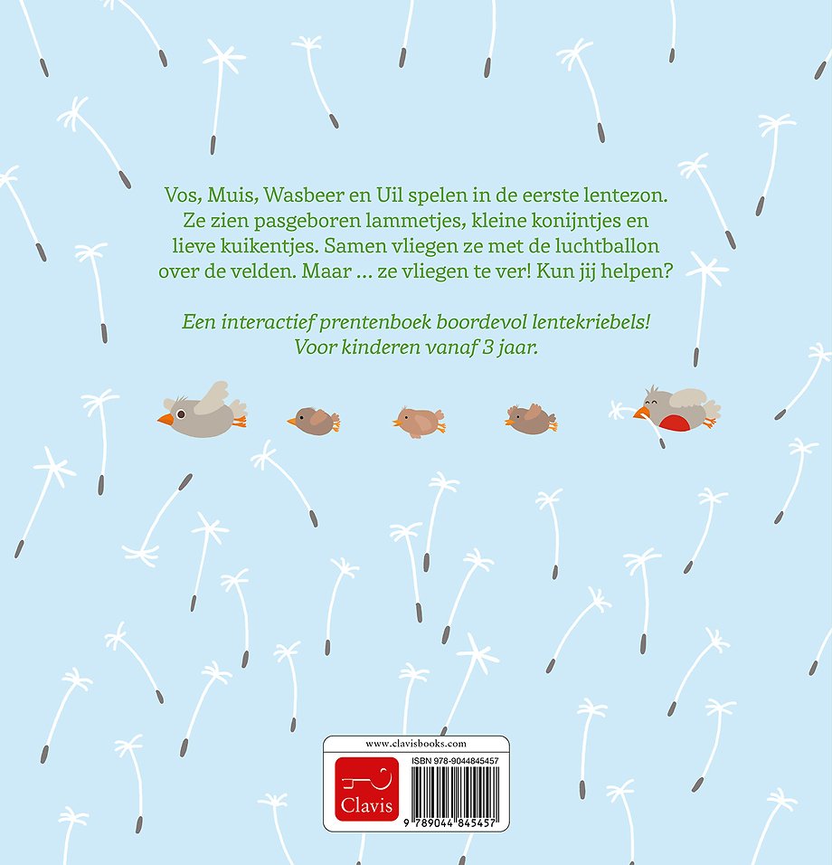 Vos, Muis, Wasbeer en Uil spelen in de eerste lentezon. Ze zien pasgeboren lammetjes, kleine konijntjes en lieve kuikentjes. Samen vliegen ze met de luchtballon over de velden. Maar … ze vliegen te ver! Kun jij helpen?