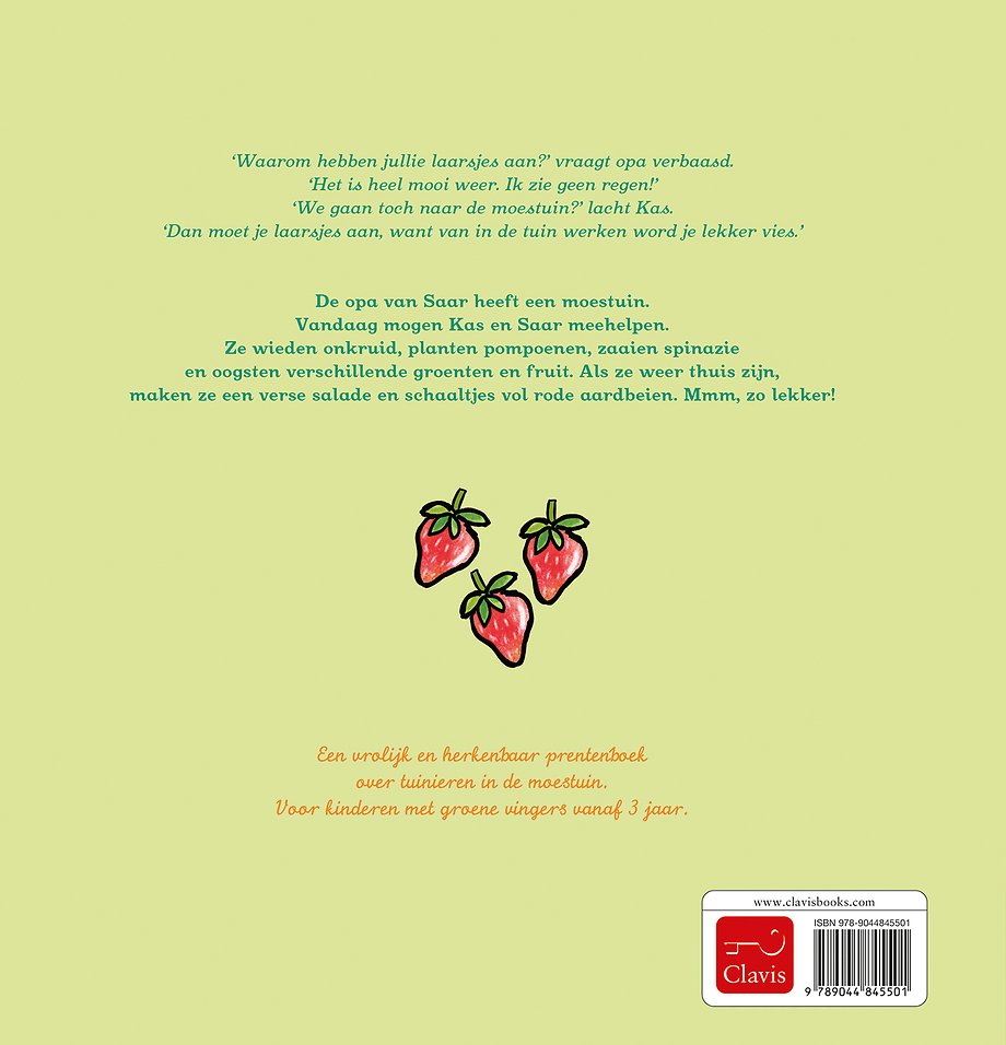 De opa van Saar heeft een moestuin. Vandaag mogen Kas en Saar meehelpen. Ze wieden onkruid, planten pompoenen, zaaien spinazie en oogsten verschillende groenten en fruit. Als ze weer thuis zijn, maken ze een verse salade en schaaltjes vol rode aardbeien. Mmm, zo lekker!