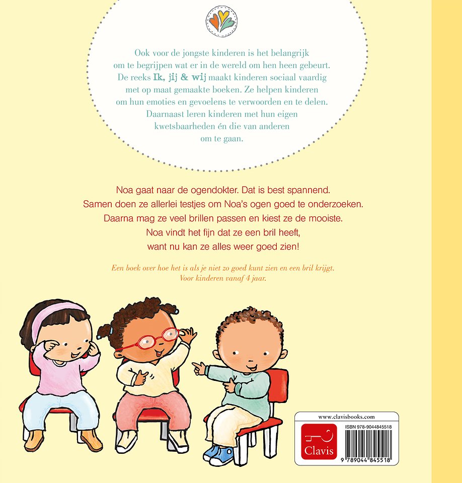 Noa gaat naar de ogendokter. Dat is best spannend. Samen doen ze allerlei testjes om Noa’s ogen goed te onderzoeken. Daarna mag ze veel brillen passen en kiest ze de mooiste. Noa vindt het fijn dat ze een bril heeft, want nu kan ze alles weer goed zien!