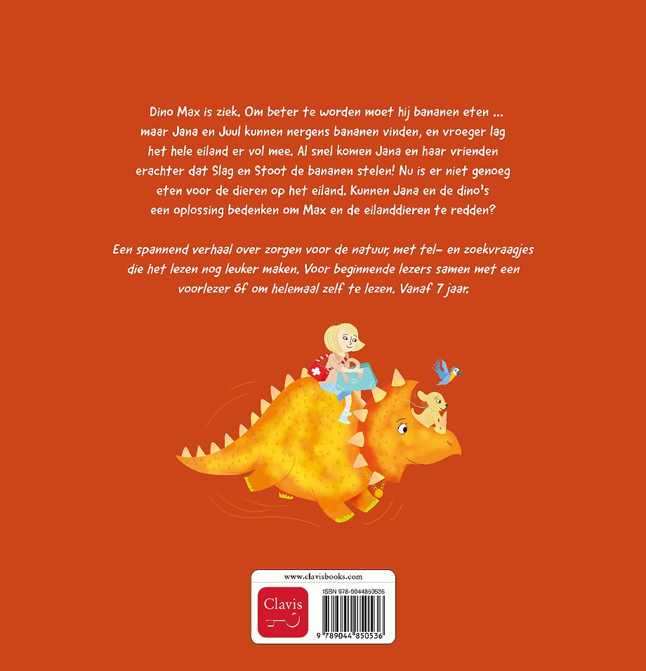 Dino Max is ziek. Om beter te worden moet hij bananen eten … maar Jana en Juul kunnen nergens bananen vinden, en vroeger lag het hele eiland er vol mee. Al snel komen Jana en haar vrienden erachter dat Slag en Stoot de bananen stelen! Nu is er niet genoeg eten voor de dieren op het eiland. Kunnen Jana en de dino’s een oplossing bedenken om Max en de eilanddieren te redden?