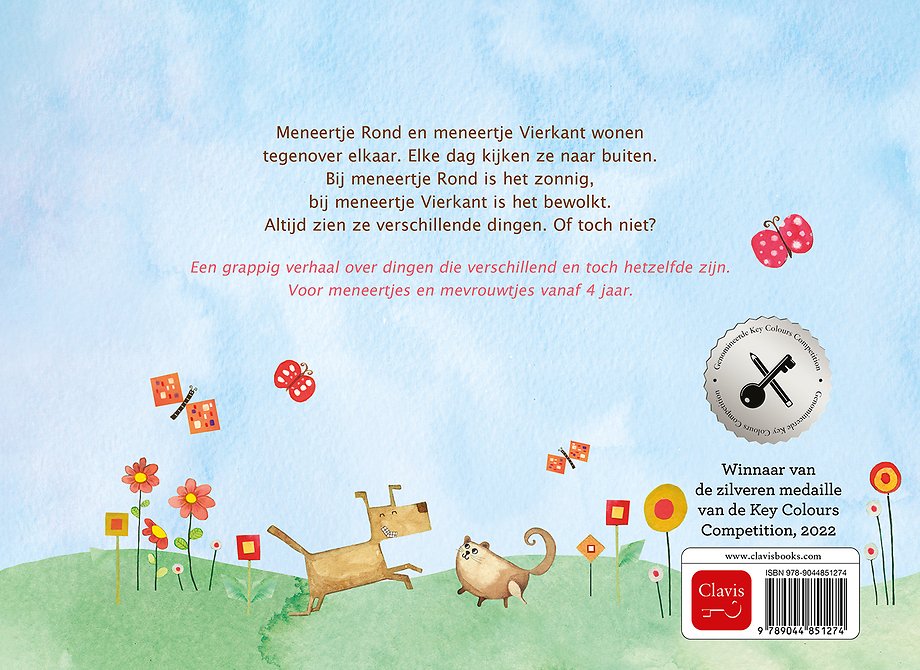 Meneertje Rond en meneertje Vierkant wonen tegenover elkaar. Elke dag kijken ze naar buiten. Bij meneertje Rond is het zonnig, bij meneertje Vierkant is het bewolkt. Altijd zien ze verschillende dingen. Of toch niet?
