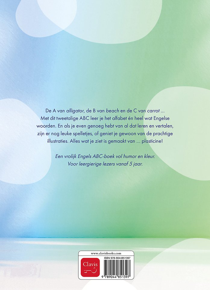 De A van alligator, de B van beach en de C van carrot … Met dit tweetalige ABC leer je het alfabet én heel wat Engelse woorden. En als je even genoeg hebt van al dat leren en vertalen, zijn er nog leuke spelletjes, of geniet je gewoon van de prachtige illustraties. Alles wat je ziet is gemaakt van … plasticine!