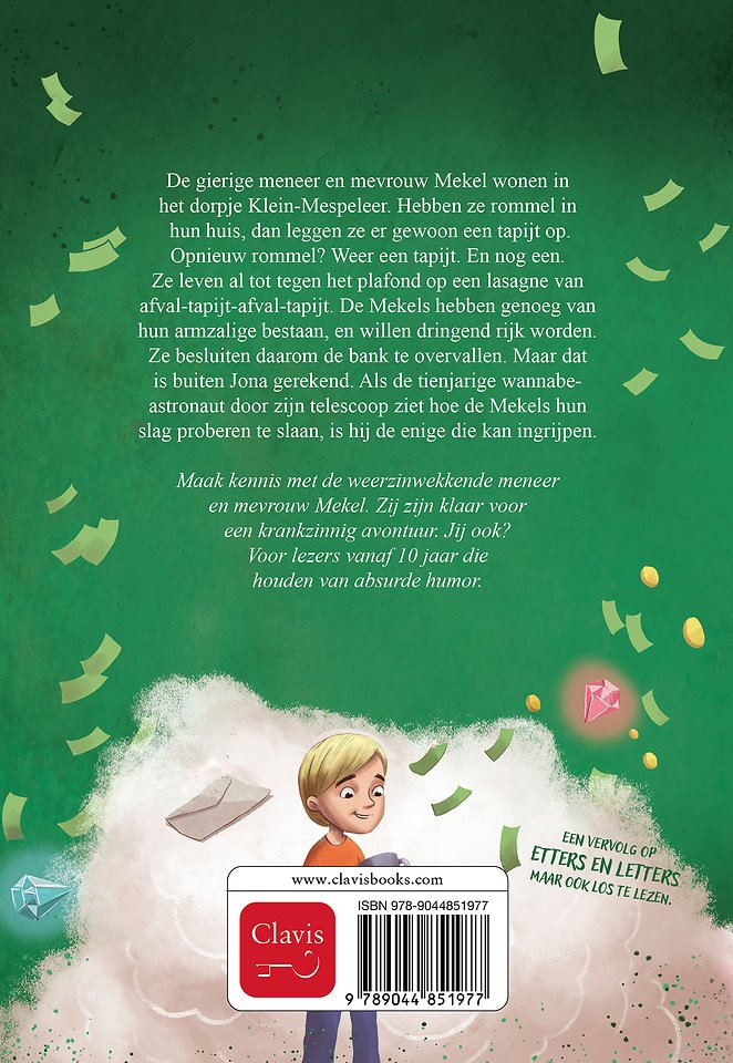De gierige meneer en mevrouw Mekel wonen in het dorpje Klein-Mespeleer. Hebben ze rommel in hun huis, dan leggen ze er gewoon een tapijt op. Opnieuw rommel? Weer een tapijt. En nog een. Ze leven al tot tegen het plafond op een lasagne van afval-tapijt-afval-tapijt. De Mekels hebben genoeg van hun armzalige bestaan, en willen dringend rijk worden. Ze besluiten daarom de bank te overvallen. Maar dat is buiten Jona gerekend. Als de tienjarige wannabe-astronaut door zijn telescoop ziet hoe de Mekels hun slag proberen te slaan, is hij de enige die kan ingrijpen.