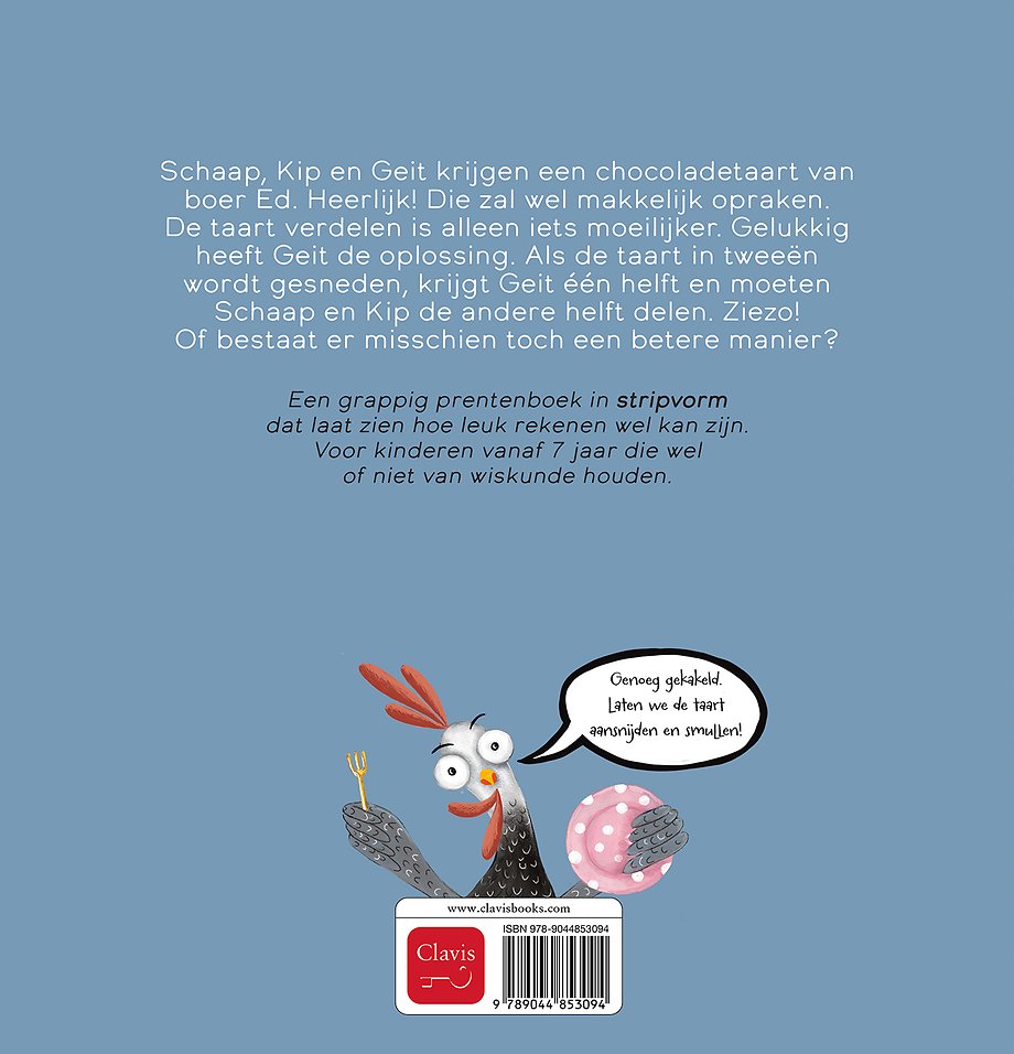 Schaap, Kip en Geit krijgen een chocoladetaart van boer Ed. Heerlijk! Die zal wel makkelijk op raken. De taart verdelen is alleen iets moeilijker. Gelukkig heeft Geit de oplossing. Als de taart in tweeën wordt gesneden, krijgt Geit één helft en moeten Schaap en Kip de andere helft delen. Ziezo! Of bestaat er misschien toch een betere manier?