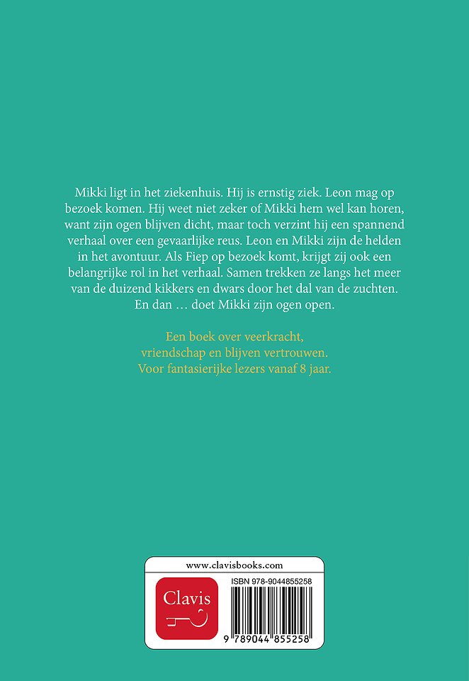 Mikki ligt in het ziekenhuis. Hij is ernstig ziek. Leon mag op bezoek komen. Hij weet niet zeker of Mikki hem wel kan horen, want zijn ogen blijven dicht, maar toch verzint hij een spannend verhaal over een gevaarlijke reus. Leon en Mikki zijn de helden in het avontuur. Als Fiep op bezoek komt, krijgt zij ook een belangrijke rol in het verhaal. Samen komen ze langs het meer van de duizend kikkers en trekken ze dwars door het dal van de zuchten. En dan … doet Mikki zijn ogen open.