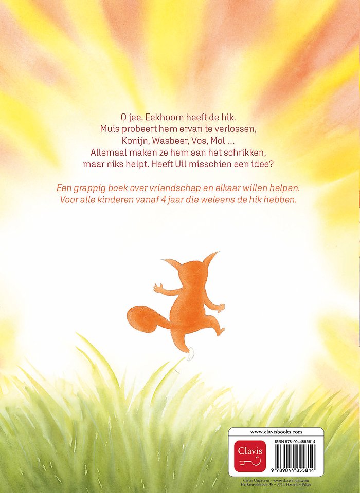 O jee, Eekhoorn heeft de hik. Muis probeert hem ervan te verlossen, Konijn, Wasbeer, Vos, Mol … Allemaal maken ze hem aan het schrikken, maar niks helpt. Heeft Uil misschien een idee?