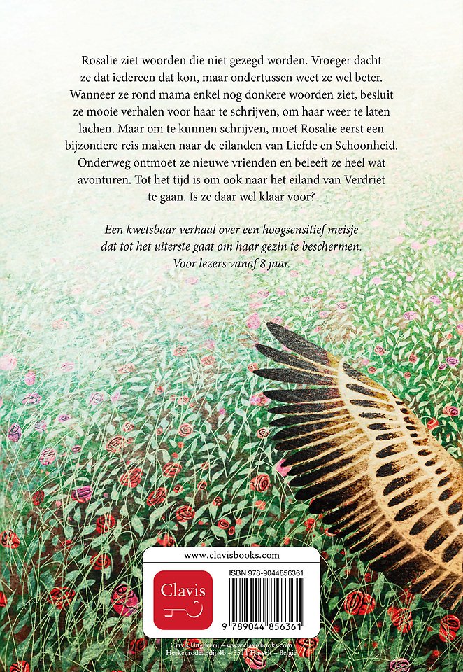Rosalie ziet woorden die niet gezegd worden. Vroeger dacht ze dat iedereen dat kon, maar ondertussen weet ze wel beter. Wanneer ze rond mama enkel nog donkere woorden ziet of soms helemaal geen woorden, besluit ze mooie boeken te schrijven, zodat mama weer kan lachen als ze de verhalen leest. Maar om te kunnen schrijven, moet Rosalie eerst kennismaken met de liefde, schoonheid en een beetje verdriet. Naar de eilanden van Liefde en Schoonheid wil ze wel, maar Verdriet?
