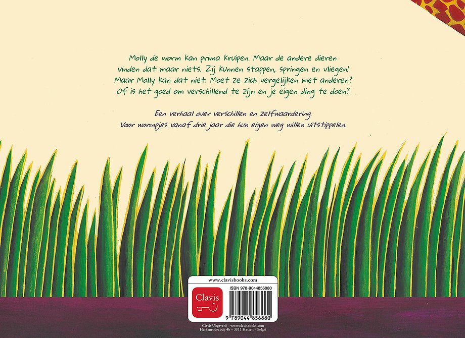 Molly de worm kan prima kruipen. Maar de andere dieren vinden dat maar niets. Zij kunnen stappen, springen en vliegen! Maar Molly kan dat niet. Moet ze zich vergelijken met anderen? Of is het goed om verschillend te zijn en je eigen ding te doen?