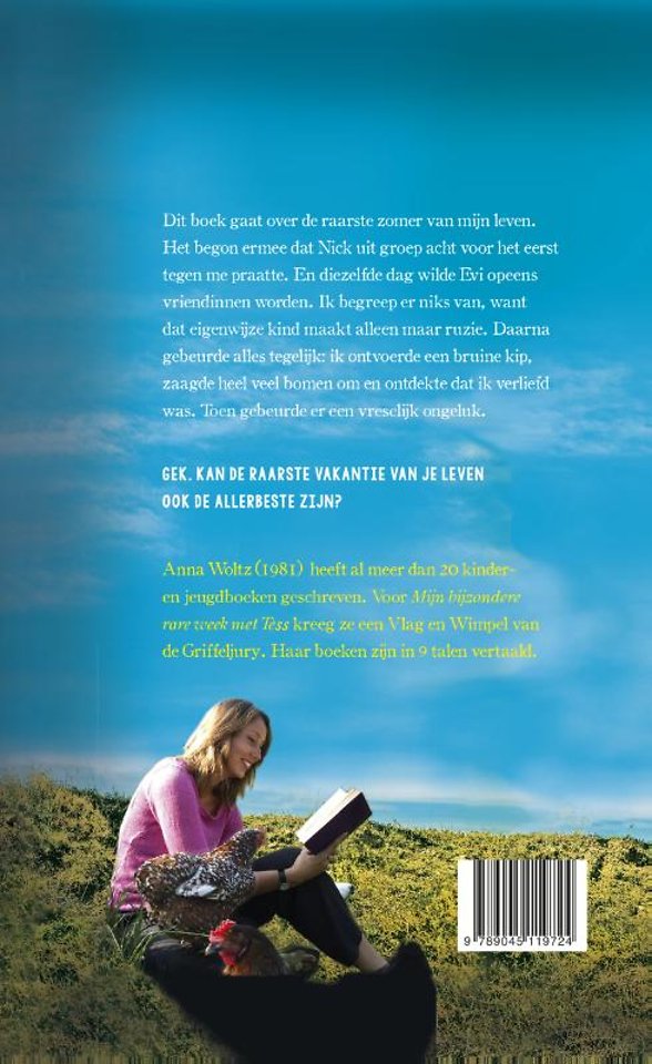 Dit boek gaat over de raarste zomer van mijn leven. Het begon ermee dat Nick uit groep acht voor het eerst tegen me praatte. En diezelfde dag wilde Evi opeens vriendinnen worden. Ik begreep er niks van, want dat eigenwijze kind maakt alleen maar ruzie. Daarna gebeurde alles tegelijk: ik ontvoerde een bruine kip, zaagde heel veel bomen om en ontdekte dat ik verliefd was. Toen gebeurde er een vreselijk ongeluk.