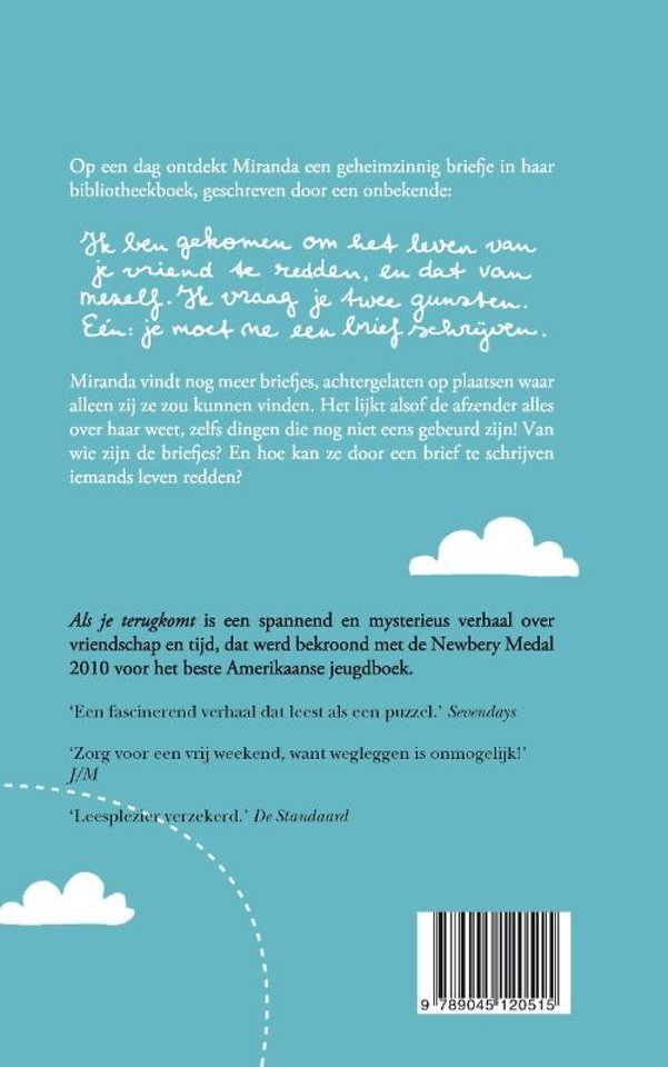 Als je terugkomt is een spannend en mysterieus verhaal over vriendschap en tijd, dat werd bekroond met de Newbery Medal 2010 voor het beste Amerikaanse jeugdboek.
