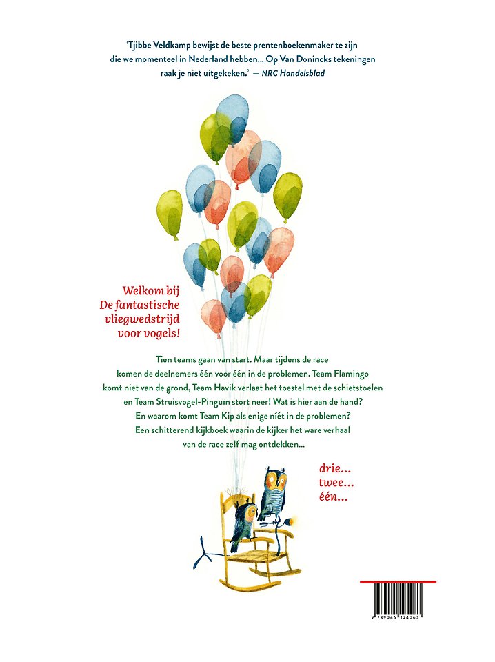 Welkom bij de Vliegwedstrijd voor Vogels! Tien teams gaan van start. Maar tijdens de race komen de deelnemers één voor één in de problemen. Team Flamingo komt niet van de grond, Team Havik verlaat het toestel met de schietstoelen en Team Struisvogel-Pinguïn stort neer! Wat is hier aan de hand? En waarom komt Team Kip als enige níét in de problemen?