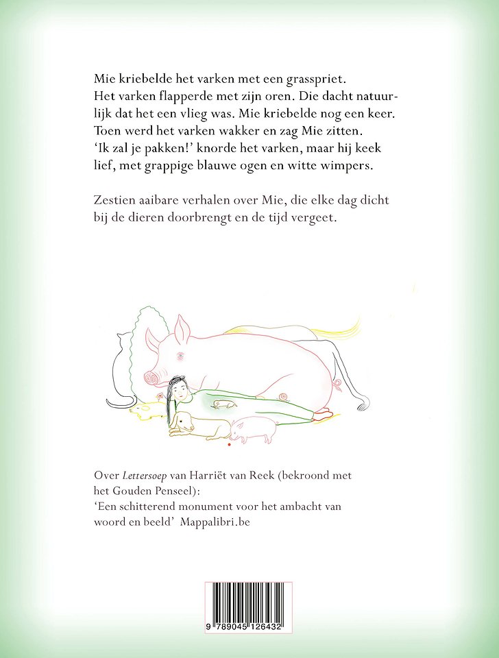 Zestien verhaaltjes over Mie, een meisje dat elke dag doorbrengt met de dieren. Ze gaat met de koe naar de zee, of ze houdt de kip in het oog, die net kuikens heeft gekregen. Ze kietelt het varken, borstelt de koe en aait de poes terwijl het buiten regent. Als de pony ponydingen doet, probeert Mie dat allemaal na te doen. En op het einde van zo’n vermoeiende dag valt Mie in het gras in slaap.