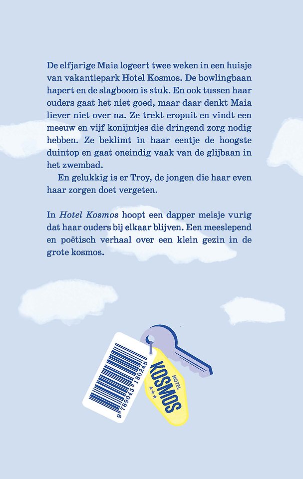 De elfjarige Maia logeert met haar ouders twee weken in een huisje op vakantiepark Hotel Kosmos. De bowlingbaan hapert en de slagboom is stuk: het vakantiepark is in verval en het zal voorgoed moeten sluiten. Ook tussen haar ouders gaat het niet goed, maar daar denkt Maia liever niet over na. Ze trekt eropuit en vindt konijntjes die dringend zorg nodig hebben. Ze beklimt in haar eentje de hoogste duintop en ze gaat oneindig vaak van de glijbaan in het zwembad. En ze ontmoet Troy, de buurjongen, op wie ze verliefd wordt en die haar haar zorgen doet vergeten.