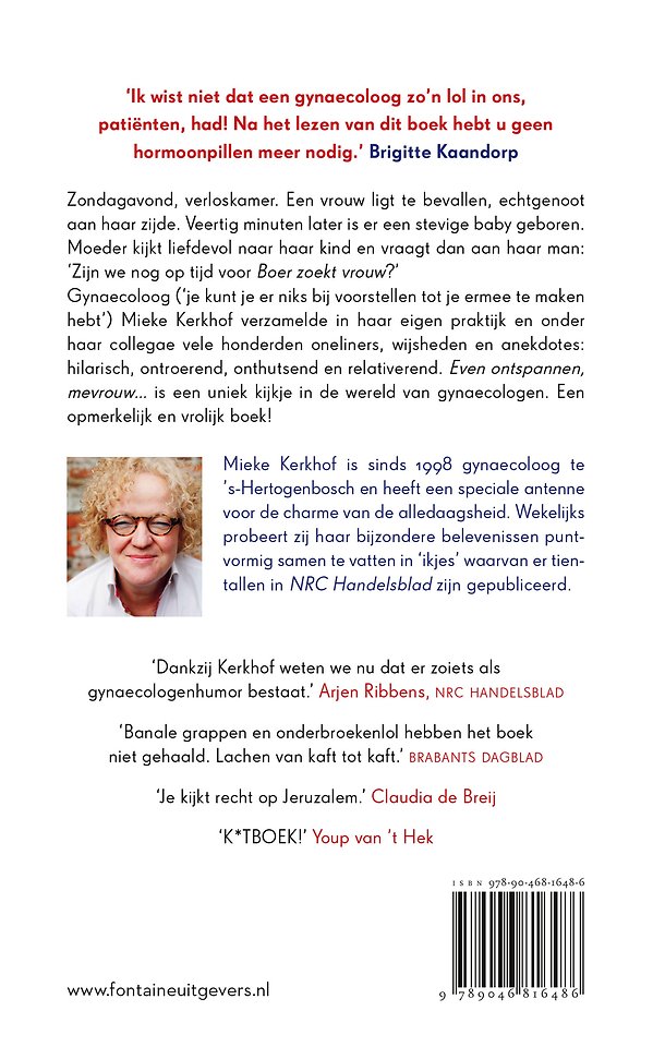 Zondagavond, verloskamer ziekenhuis 's-Hertogenbosch. Een vrouw ligt te bevallen, echtgenoot aan haar zijde. Veertig minuten later is er een stevige baby geboren. Moeder kijkt liefdevol naar haar kind en vraagt dan aan haar man: 'Zijn we nog op tijd voor Boer zoekt vrouw?' Gynaecoloog ('je kunt je er niks bij voorstellen tot je ermee te maken hebt') Mieke Kerkhof verzamelde in haar eigen praktijk en onder haar collegae vele honderden oneliners, wijsheden en anekdotes: hilarisch, ontroerend, onthutsend en relativerend. 'Even ontspannen mevrouw...' is een uniek kijkje in de wereld van gynaecologen. Een opmerkelijk en vrolijk boek!