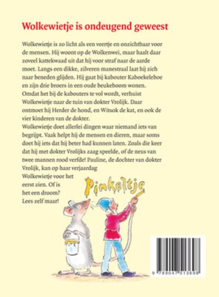 Wolkewietje is zo licht als een veertje en onzichtbaar voor de mensen. Hij woont op de Wolkenwei, maar haalt daar zoveel kattekwaad uit dat hij voor straf naar de aarde moet. Langs een dikke, zilveren manestraal laat hij zich naar beneden glijden. Hij gaat bij kabouter Kaboekeleboe en zijn drie broers in een oude beukeboom wonen. Omdat het bij de kabouters te vol wordt, verhuist Wolkewietje naar de tuin van dokter Vrolijk. Daar ontmoet hij Herder de hond, en Witsok de kat, en ook de vier kinderen van de dokter. Wolkewietje doet allerlei dingen waar niemand iets van begrijpt. Vaak helpt hij de mensen en dieren, maar soms doet hij iets dat hij beter had kunnen laten. Zoals die keer dat hij met dokter Vrolijks zaag speelde, of de neus van twee mannen rood verfde! Pauline, de dochter van dokter Vrolijk, kan op haar verjaardag Wolkewietje voor het eerst zien. Of is het een droom?