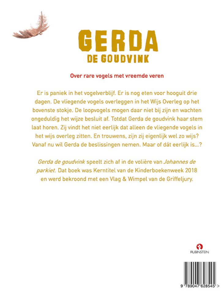 Gerda de goudvink speelt zich af in de volière van Johannes de parkiet. Dat boek was Kerntitel van de Kinderboekenweek 2018 en werd bekroond met een Vlag & Wimpel van de Griffeljury.