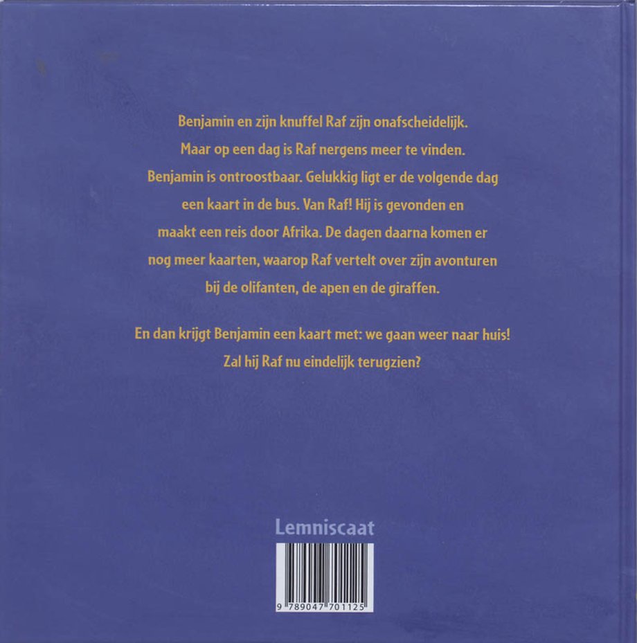 Benjamin raakt Raf, zijn lievelingsknuffel, kwijt. Hij is ontroostbaar. Gelukkig blijkt dat Raf Benjamin niet vergeten is. Iemand heeft hem gevonden en mee naar Afrika genomen. Raf stuurt kaarten naar huis over zijn avonturen - zo kan Benjamin met hem mee leven en zijn verdriet vergeten.