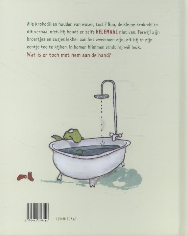 Kleine krokodil is niet zoals zijn broertjes en zusjes. Terwijl zij spartelen, sproeien en sproetsen, blijft hij liever aan de kant. Hij houdt niet van water.
