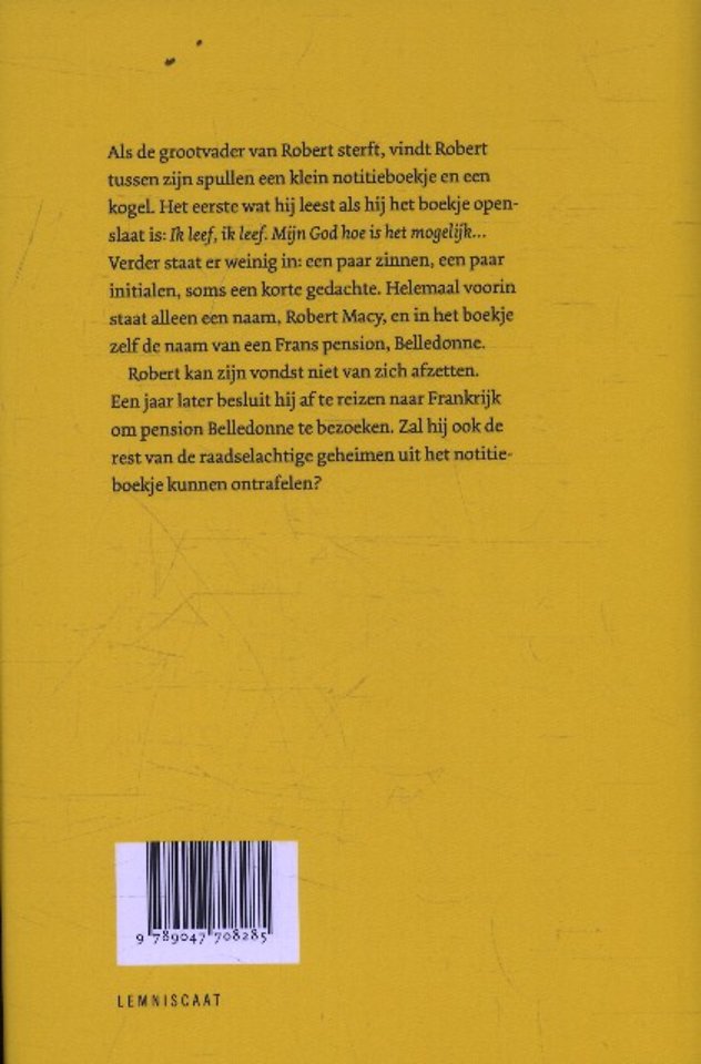 ‘Ik leef, ik leef. Mijn God hoe is het mogelijk…’ is het eerst dat Robert leest als hij het notitieboekje openslaat. Hij heeft het gevonden tussen de spullen van zijn opa die net is overleden: een klein zakboekje en een kogel. Verder staat er weinig in het boekje. Een paar zinnen, enkele initialen, soms een korte gedachte, een naam. Helemaal voorin alleen ‘Robert Macy’. Het dateert uit 1944.