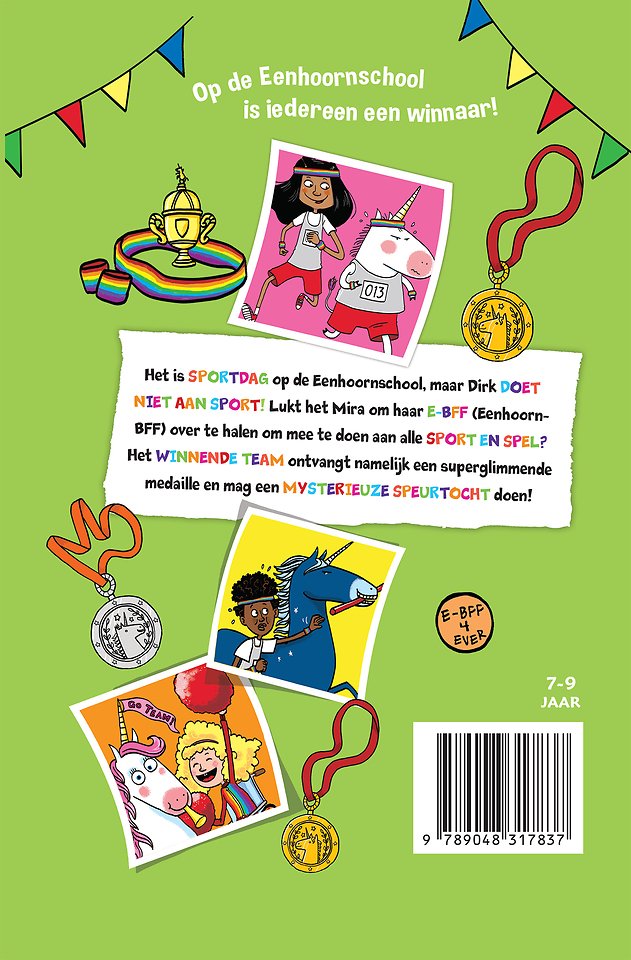 Het is sportdag op de Eenhoornschool, maar Mira’s eenhoorn Dirk doet NIET aan sport. Kan Mira haar E-BFF (Eenhoorn Best Friend Forever) overtuigen mee te doen aan de wedstrijden en spelletjes? De prijs voor het winnende team is een medaille én een Magische Regenboogtocht, dus Mira zet alles op alles om te winnen. Als dat maar goed gaat...