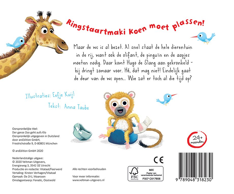 Ringstaartmaki Koen moet plassen! Maar de wc is al bezet. Al snel staat de hele dierentuin in de rij, want ook de olifant, de pinguïn en de aapjes moeten naar de wc. Daar komt Hugo de Slang aan gekronkeld - hij dringt zomaar voor. Hé, dat mag niet! Eindelijk gaat de deur van de wc open... Wie zat er toch al die tijd op?