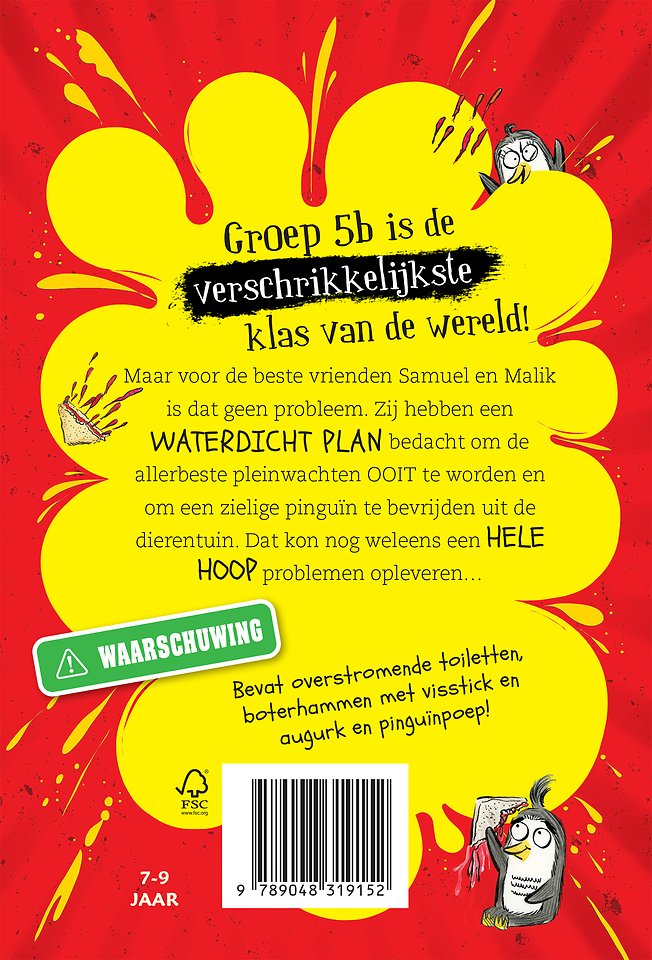 Volgens het schoolhoofd is groep 5B letterlijk de verschrikkelijkste klas van de wereld! Ze zegt dat school niet draait om gek doen, grapjes en plezier. School is om te leren en het wordt hoog tijd dat de kinderen in 5B hun best gaan doen om te excelleren. Maar Sam en Malik wilden niet létterlijk de wc’s laten overstromen toen ze het schoolplein in de gaten moesten houden. En het was zéker niet hun bedoeling om een pinguïn mee naar huis te nemen na het schoolreisje naar de dierentuin. Zulke dingen gebeuren gewoon, zelfs wanneer ze een plan bedenken dat gewoon niet kán mislukken…