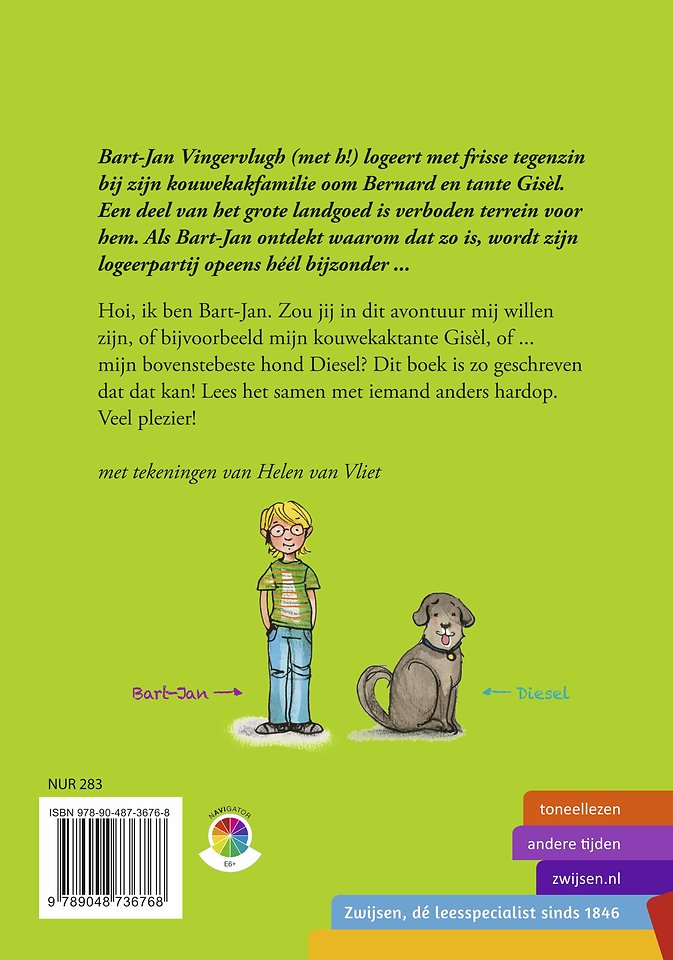 Bart-Jan Vingervlugh (met h!) logeert met frisse tegenzin bij zijn kouwe kakfamilie oom Bernard en tante Madelief. Een deel van het grote landgoed is verboden terrein voor hem. Als Bart-Jan ontdekt waarom dat zo is, wordt zijn logeerpartij opeens héél bijzonder ... en krijgt hij voor oom en tante een zuur staartje. Hoi, ik ben Bart-Jan. Zou jij in dit avontuur mij willen zijn, of bijvoorbeeld mijn kouwe kak-tante Madelief, offe ... de stoere ridder Rammerop? Dit boek is zo geschreven dat dat kan! Verdeel de rollen en lees om de beurt voor.