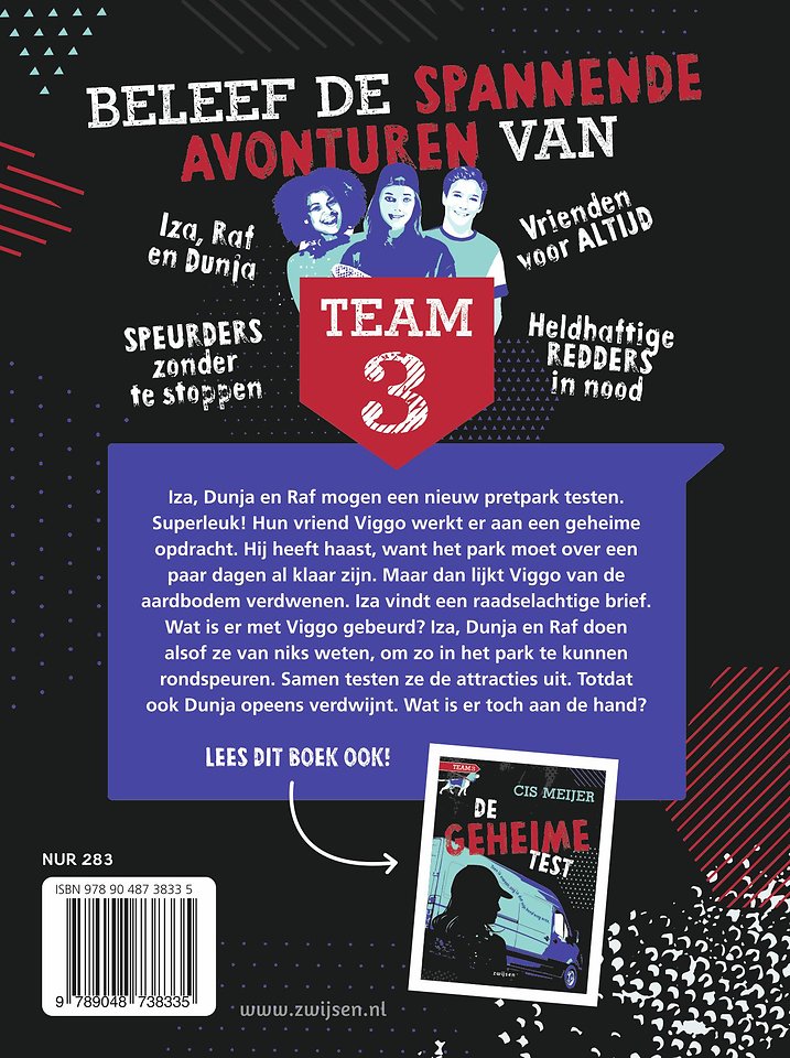 Spannende detectiveserie Team 3 van thrillerauteur Cis Meijer voor kinderen vanaf 9 jaar. Dit is het tweede boek uit de serie. Beleef alle avonturen van Raf, Dunja en Iza. In Het duistere pretpark mogen ze een nieuw pretpark testen. Superleuk! Hun vriend Viggo werkt er aan een geheime opdracht. Hij heeft haast, want het park moet over een paar dagen al klaar zijn.