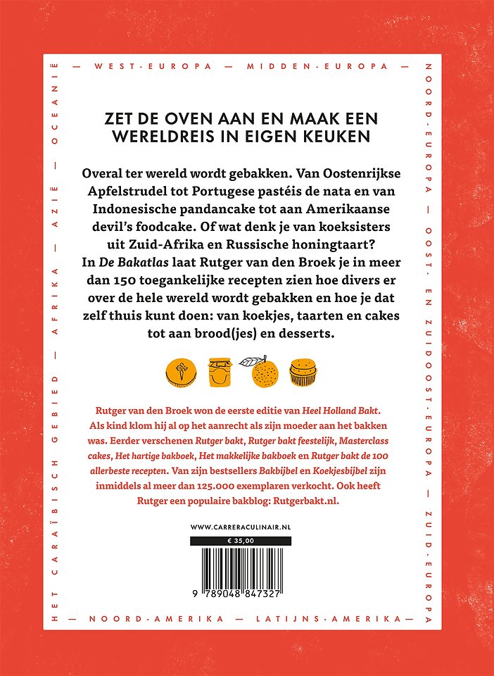 Overal ter wereld wordt gebakken. Van Oostenrijkse apfelstrudel tot Portugese pastéis de nata en van Indonesische pandancake tot aan Amerikaanse devil's foodcake. Of wat denk je van koeksisters uit Zuid-Afrika en Russische honingtaart? In De Bakatlas laat Rutger van den Broek je in meer dan 150 toegankelijke recepten zien hoe divers er over de hele gebakken wordt en hoe je dat zelf thuis kunt doen: van koekjes, taarten en cakes tot aan brood(jes) en desserts.