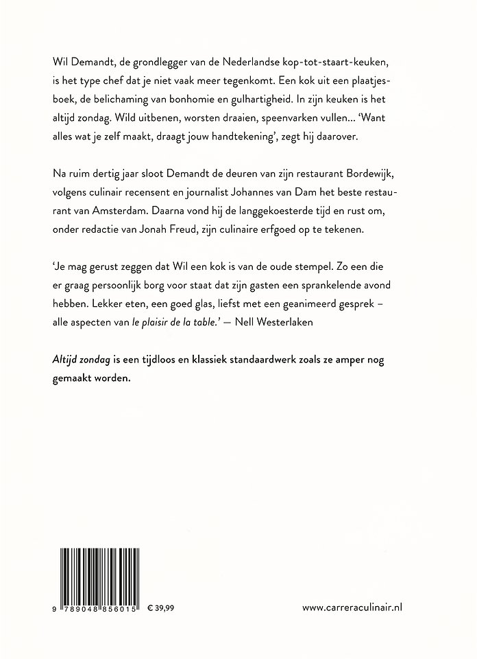 Tot op de dag van vandaag is Wil bezig met koken, eten en lezen en schrijven over eten. In Altijd zondag heeft hij, onder redactie van Jonah Freud, voor eens en voor altijd zijn onnavolgbare nalatenschap opgetekend.