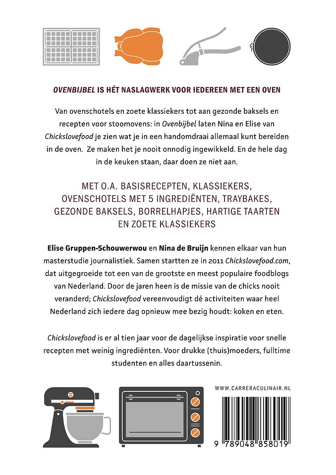Van ovenschotels en zoete klassiekers tot gezonde baksels en recepten voor stoomovens: in de Ovenbijbel laten Nina en Elise van Chickslovefood je zien wat je allemaal uit je oven kan halen. Ze blijven hun keukenfilosofie trouw en maken het dus nooit onnodig ingewikkeld en laten je nooit de hele dag in de keuken staan.