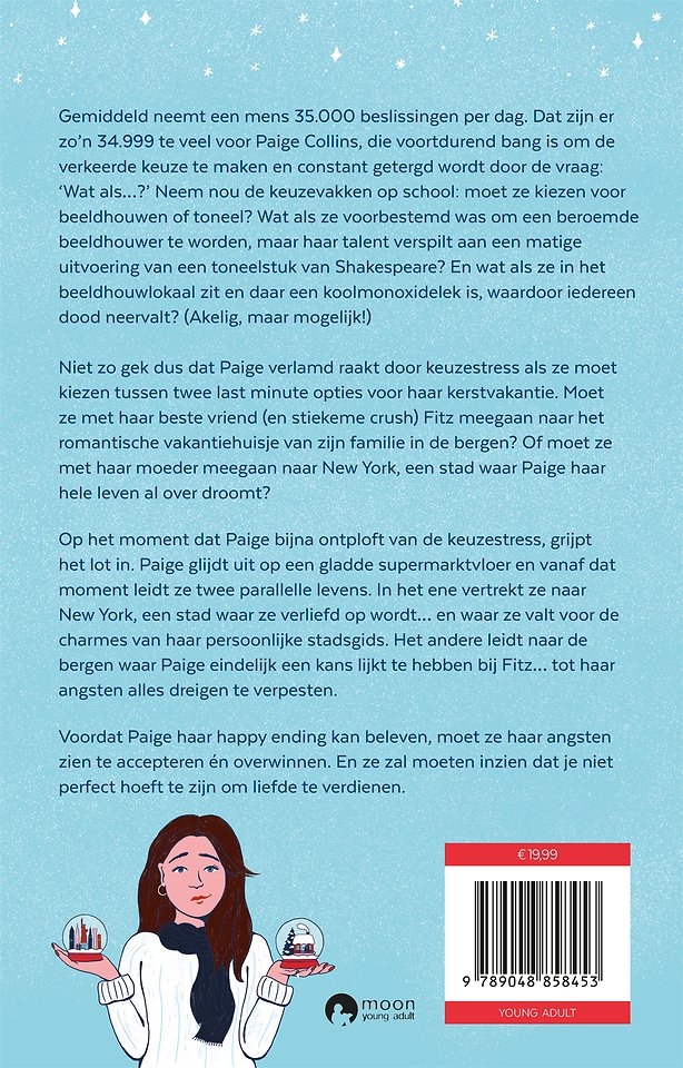De gemiddelde persoon neemt zo'n 35.000 beslissingen per dag. Dat zijn er ongeveer 34.999 te veel voor Paige Collins, die elke keer weer bang is dat ze de verkeerde keus maakt. Wat als het haar bestemming is om een beroemde kunstenaar te worden, maar ze haar talent verspilt en voor drama kiest? Wat als er een koolmonoxidelek is in het kunstlokaal, en iedereen dood neervalt? (Heftig, maar mogelijk!)Niet zo gek dus dat Paige, als ze moet kiezen tussen twee lastminute opties voor haar kerstvakantie, verlamd raakt door de angst dat ze de verkeerde keuze maakt. Moet ze met haar beste vriend (en stiekeme crush) Fitz meegaan naar het romantische vakantiehuisje van zijn familie in de bergen? Of moet ze met haar moeder meegaan naar New York, een stad waar Paige haar hele leven al over droomt?Op het moment dat Paige ongeveer ontploft van de keuzestress, grijpt het lot in. Paige glijdt uit op een gladde supermarktvloer en vanaf dat moment leidt ze twee paralelle levens. In het ene vertrekt ze naar New York, een stad waar ze verliefd op wordt... en waar ze valt voor de charmes van haar onverwachte stadsgids. Het andere leidt naar de bergen waar Paige eindelijk een kans lijkt te hebben bij Fitz... tot haar angsten alles dreigen te verpesten.Voordat Paige haar happy ending kan beleven moet ze haar angsten zien te accepteren én overwinnen. En ze zal moeten inzien dat je niet perfect hoeft te zijn om liefde te verdienen.