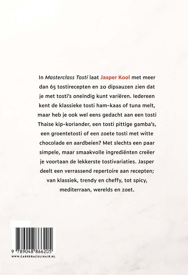 In Masterclass Tosti laat Jasper Kool aan de hand van 50 recepten zien dat je met tosti's oneindig kunt variëren. Iedereen kent de tosti ham-kaas en tosti ananas, maar heb je ook weleens gedacht aan een tosti met gamba's en sambalkaas, een zoete tosti met witte chocolade en aardbeien, of juist hartig met gegrilde bataat of een tosti Chinese baopao? Met slechts een paar simpele, maar smaakvolle ingrediënten creëer je de lekkerste tostivariaties! Verrassende tostirecepten ingedeeld in Klassiek, Trendy, Cheffy, Hollands, Spicy, Mediterraan, Werelds en Zoet.