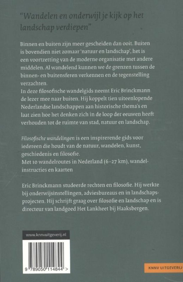 Ga naar buiten met een filosoof en de natuur ziet er ineens heel anders uit... 'Filosofische wandelingen' is een inspirerende gids voor liefhebbers van natuur, geschiedenis en filosofie. In dit boek koppelt landschapsfilosoof Eric Brinckmann tien Nederlandse landschappen aan historische thema's en laat zien hoe het denken zich in de loop der eeuwen heeft verhouden tot de ruimte. Het resultaat is een veelzijdige mix van filosofische essays, wandelingen, historische feiten, anekdotes & citaten.