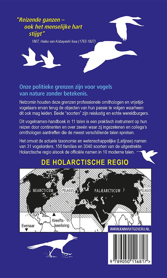 Onze politieke grenzen zijn voor vogels van nature zonder betekenis. Net zomin houden deze grenzen professionele ornithologen en amateurvogelaars ervan terug de objecten van hun passie te volgen ongeacht waarheen de reis gaat en welke grenzen daarvoor gepasseerd moeten worden. Beide “soorten” zijn reislustig en echte wereldburgers. Dit vogelnamen-handboek in 11 talen is een praktisch instrument op hun reizen door continenten en over zeeën waar zij ingezetenen en collega’s ornithologen aantreffen die de meest verschillende talen spreken.