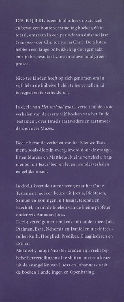 De bijbel bevat een bonte verzameling boeken ontstaan in een periode van duizend jaar (van 900 voor Chr. tot 130 na Chr.). Nico ter Linden vertelt en verheldert de bijbel spelenderwijs voor de lezers van vandaag. Het verhaal gaat... zal uit vijf delen bestaan.