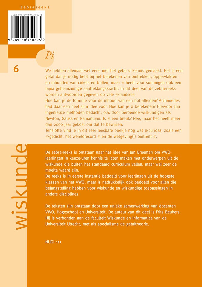 We hebben allemaal wel eens met het getal π kennis gemaakt. Het is een getal dat je nodig hebt bij het berekenen van omtrekken, oppervlakten en inhouden van cirkels en bollen, maar π heeft voor sommigen ook een bijna geheimzinnige aantrekkingskracht. In dit deel van de Zebra-reeks worden antwoorden gegeven op vele π-raadsels. Hoe kan je de formule voor de inhoud van een bol afleiden? Archimedes had daar een heel slim idee voor. Hoe kan je π berekenen? Hiervoor zijn ingenieuze methoden bedacht, onder andere door beroemde wiskundigen als Newton, Gauss en Ramanujan. Is π een breuk? Nee, maar het heeft meer dan 2000 jaar gekost om dat te bewijzen. Ten slotte vind je in dit zeer leesbare boekje nog wat π-curiosa, zoals een π-gedicht, het wereldrecord π en de wetgeving(!) omtrent π.